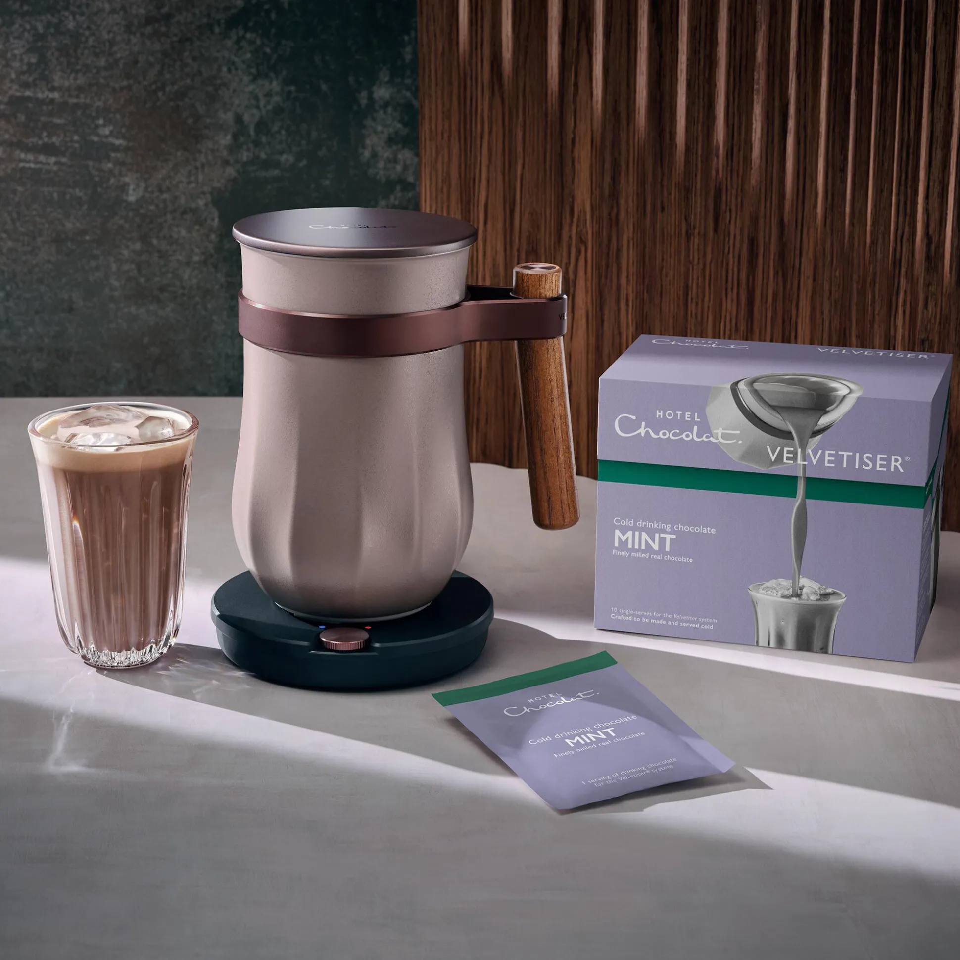 Made with finely milled real chocolate, cold drinking chocolate is designed to work in harmony with our ALL-NEW Velvetiser ®. This recipe works exclusively with its cold setting, which pulses to gently meld chocolate with pre-chilled milk or dairy alternative. The Velvetiser’s unique vortex-effect delivers each recipe with a velvet-smooth texture and unrivalled chocolate crema.