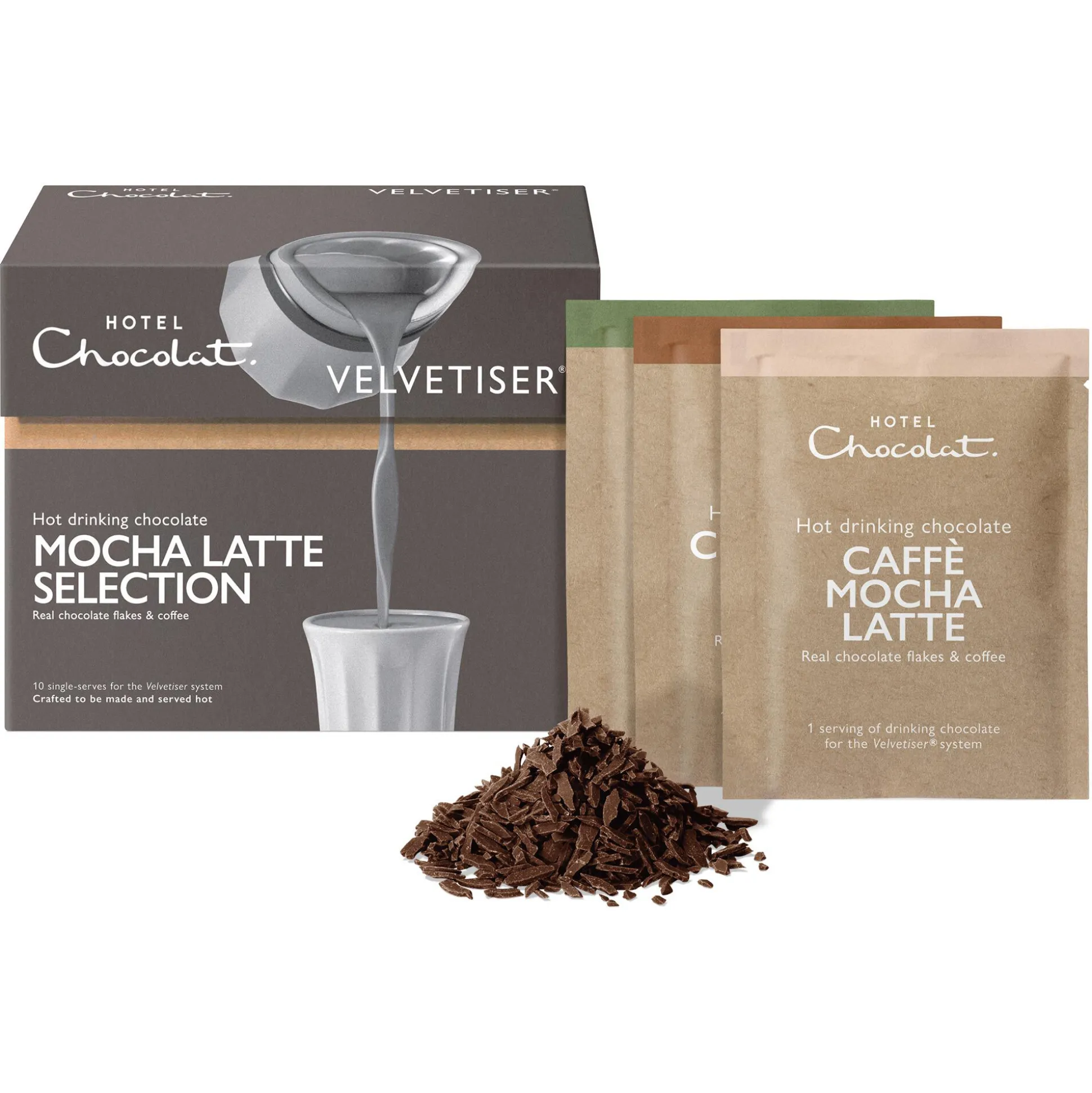Each of the 10 single-serve Mocha Latte sachets contain real chocolate flakes and coffee. Perfectly portioned for your Podcup™, they’re designed to work in harmony with the Velvetiser®* – the complete system for hot and cold barista-grade drinking chocolate.