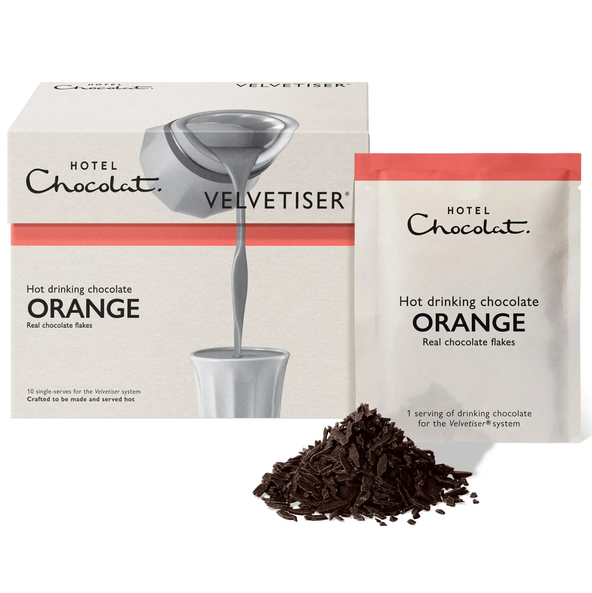 Each of these 10 Orange hot chocolate sachets are precisely measured for your Podcup™ and designed to work in harmony with the Velvetiser®* – the complete system for hot and cold barista-grade drinking chocolate.