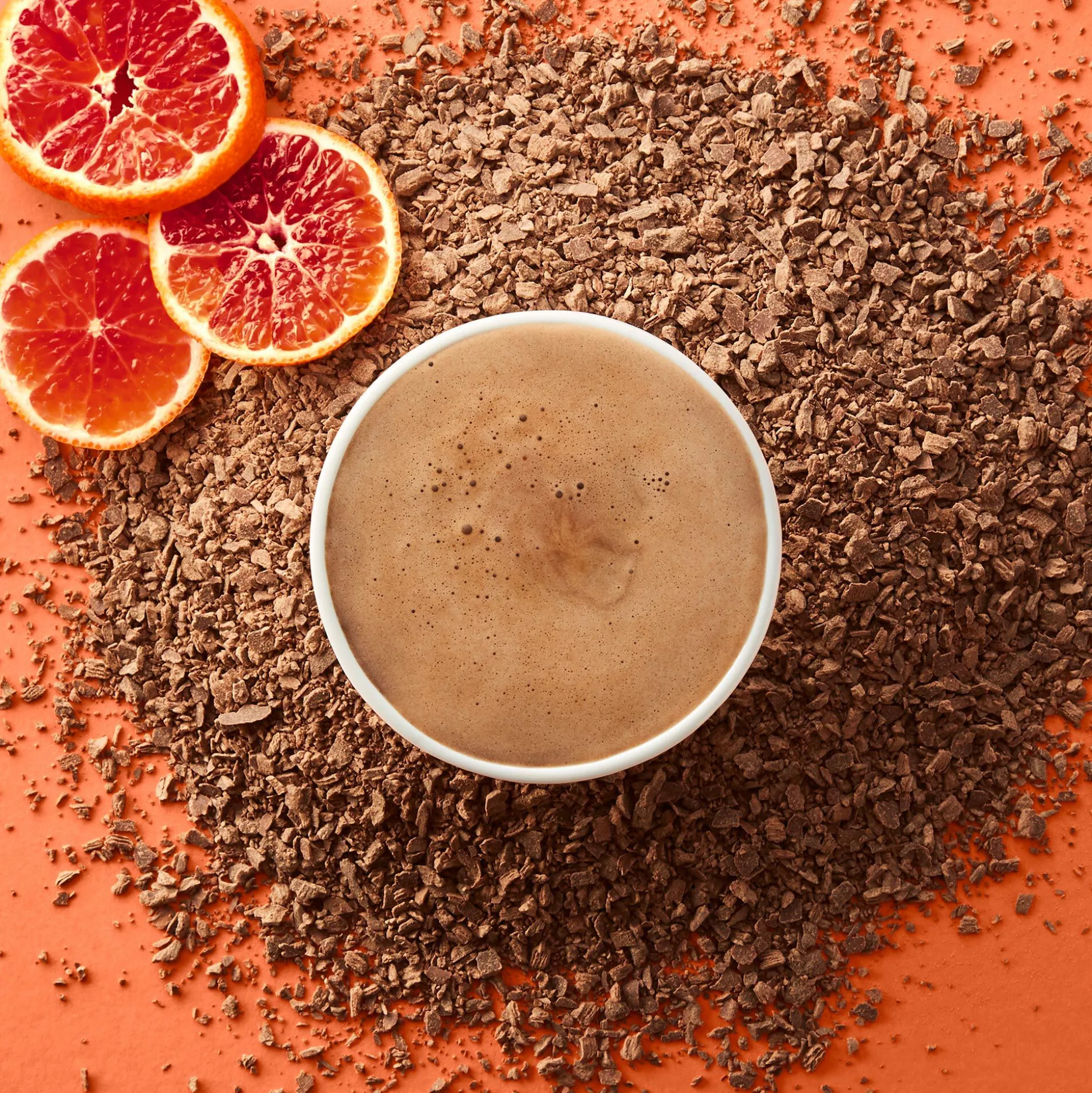 For our Orange hot chocolate, we reached for Supermilk, our 65% cacao chocolate that brings together the best of both chocolate worlds: all the creaminess of milk, all the depth of dark. For the zing, we selected blood orange – its zesty profile and subtle raspberry notes bring a distinctive citrus kick.