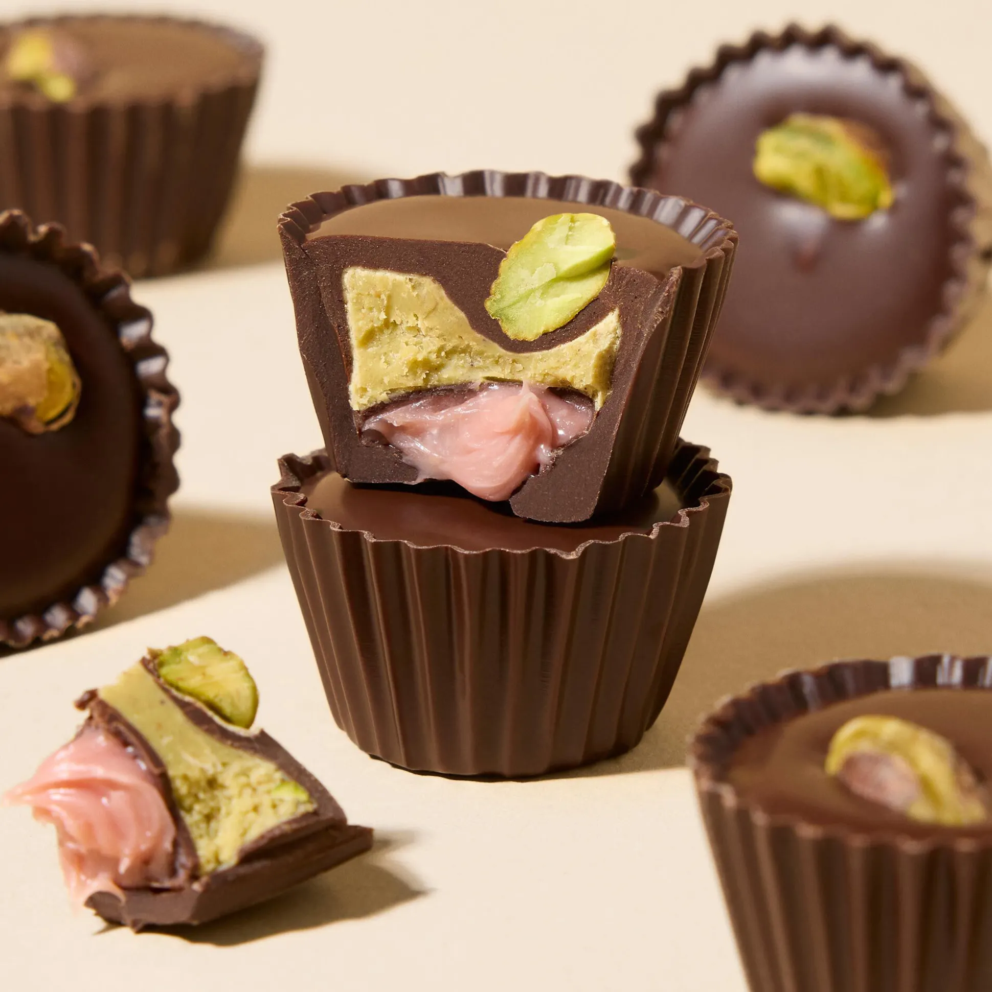As lovers of raspberry, dark chocolate and pistachio, our chocolatiers wanted to give each flavour in this recipe an equal opportunity to sing. Each layer is clearly distinguishable, working in harmony to create a beautifully balanced tasting experience. Our experts knew that our house dark would be the perfect way to round off those natural raspberry and pistachio notes. Deep yet unbelievably smooth, it’s created with the highest-quality cacao, allowing you to taste all the intricate notes of the cacao bean.