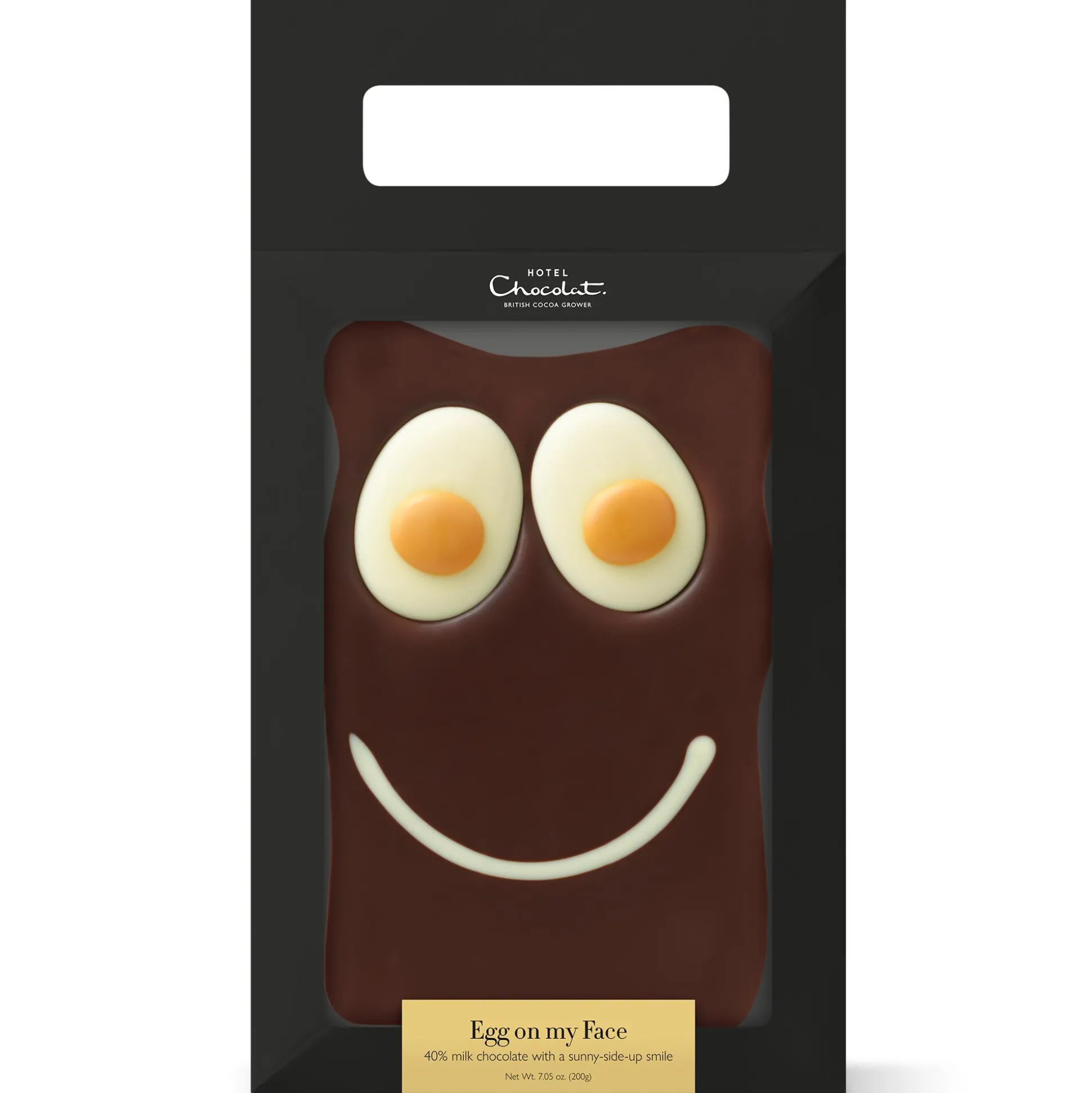Weighing 200g, this piece of indulgence has a satisfying snap when broken, but melts astonishingly on the tongue. Inspired by the flowing shape that cooled molten chocolate takes on our chocolatier’s table, this smiley treat looks almost too good to eat. Sketched by one of our in-house artists before being transformed into chocolate, our Chocolate Slab is a light-hearted take on the typical breakfast egg.