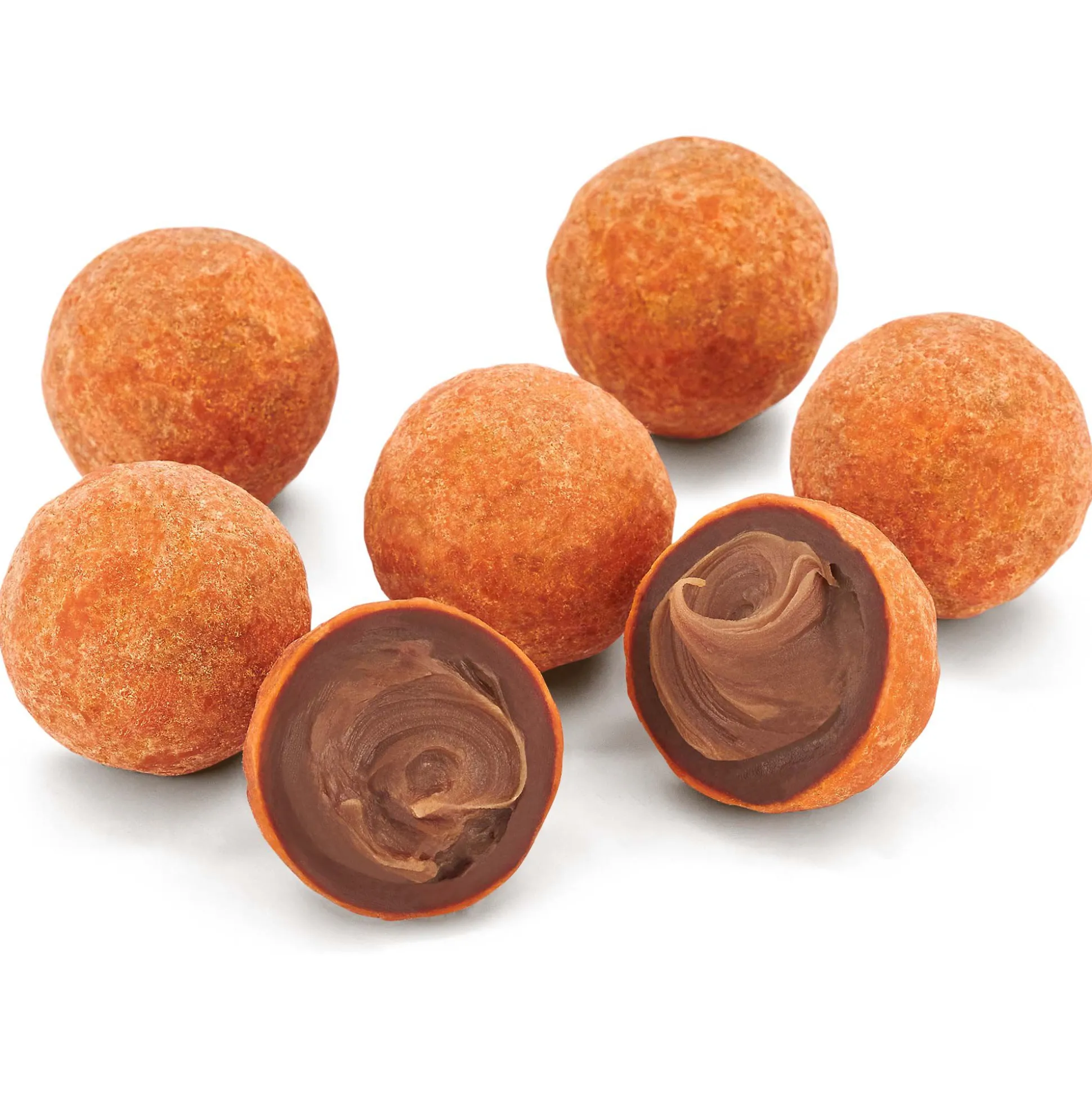 Our chocolatiers spent months in our Inventing Room to capture and elevate the distinctive citrus notes, experimenting with different grades before settling on our signature mellow 40% milk chocolate for our Grand Mimosa’s zippy yet snappable orange cacao shell (delicately coated with our house white chocolate and panned to create a naturally vibrant orange hue – no artificial colours here).