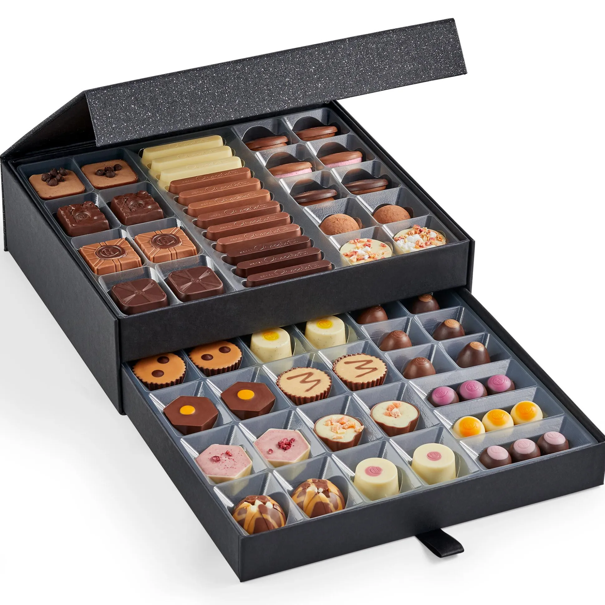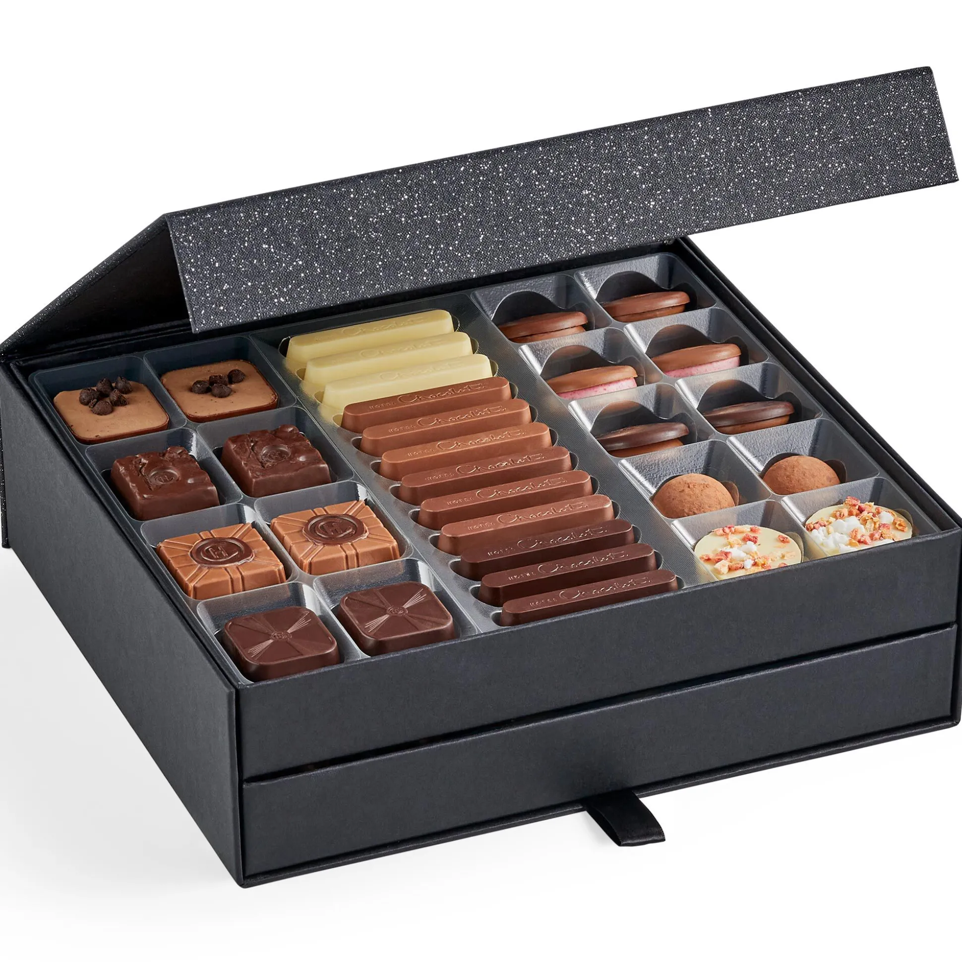 Dark chocolate contains minimum 70% cocoa solids. Milk chocolate contains minimum 40% cocoa solids, minimum 20% milk solids. White chocolate contains minimum 36% cocoa butter, minimum 27% milk solids. Caramel milk chocolate contains minimum 36% cocoa solids, minimum 26% milk solids. Chocolate contains minimum 67% cocoa solids, minimum 13% milk solids. For allergens, including cereals containing gluten, see ingredients in BOLD. All chocolates in the box may contain tree nuts, peanuts, milk, soya, gluten, wheat, egg, sesame. Caution: Although every care has been taken to remove nut shells, some may still remain.